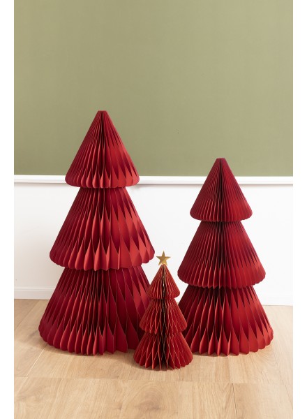 1 Decorazione carta cm 40 Albero rosso con stella. Una decorazione in carta a nido d’ape a forma di albero di Natale, completata con una stella dorata in cima e spago per appenderla, è un dettaglio festoso, leggero ed elegante, perfetto per uno stile nordico, naturale o minimal chic. Questa decorazione combina volumi leggeri e una forma iconica con un tocco brillante. Il corpo dell’albero, realizzato in carta a nido d’ape rosso, si apre a fisarmonica creando un effetto tridimensionale morbido e arioso. La stella dorata, applicata in cima, aggiunge luce e un accento festivo. Il tutto è completato da un cordoncino o spago (string), che consente di appenderla dove vuoi.