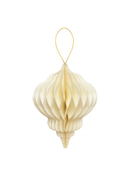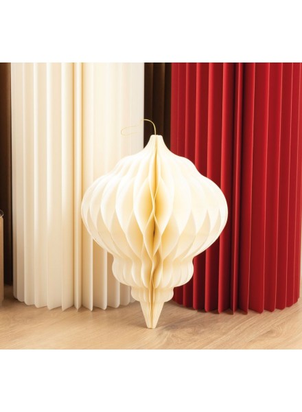 1 Decorazioni carta cm 40 Avorio. Una decorazione a sospensione di grande impatto visivo, realizzata in carta pieghevole effetto honeycomb, dal diametro di 40 cm. Leggera ma scenografica, è rifinita con un profilo oro opaco che ne esalta la forma e aggiunge un tocco sofisticato. Completa di cordino coordinato per una facile sospensione, si adatta perfettamente ad ambienti dallo stile nordico, elegante o contemporaneo.