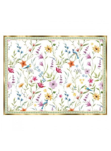 4 Tovagliette in carta cm 43X33 Le jardin. La tovaglietta Le Jardin è impreziosita da una pioggia di piccoli fiorellini primaverili, variopinti e delicati: tocchi di rosa, giallo, lilla, azzurro e bianco si intrecciano in una composizione leggera e vivace, come un prato in fiore. I fiori, minuti e diffusi, creano un effetto decorativo ricco ma armonioso, capace di illuminare la tavola senza appesantirla.