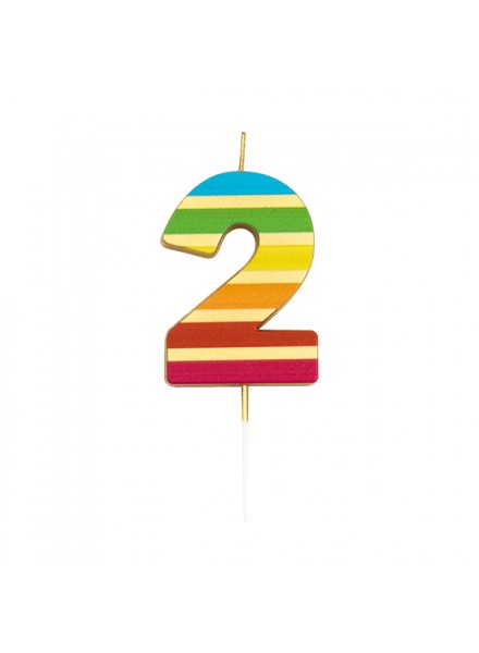 1 candelina due cm 9.5 Gold Stripes. La candelina numerale a righe orizzontali arcobaleno ed oro è un dettaglio vivace e luminoso che unisce colore e raffinatezza in un’unica decorazione. Le fasce multicolor creano un effetto allegro e dinamico, mentre le righe oro aggiungono un tocco brillante e sofisticato, perfetto per valorizzare qualsiasi torta di compleanno.