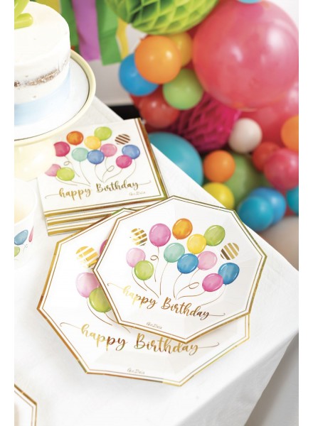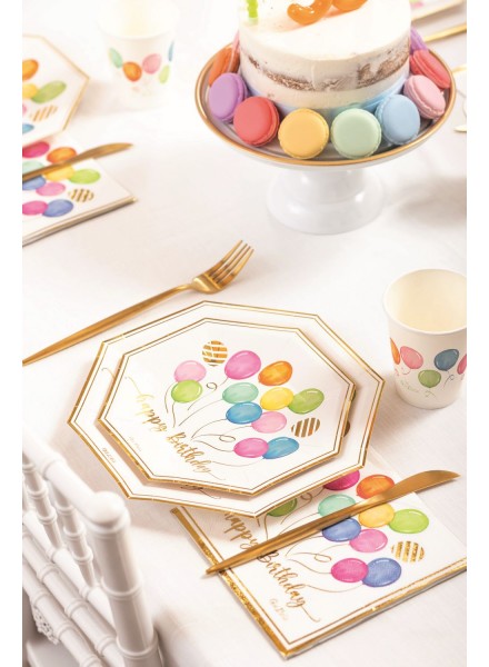 16 tovaglioli 3 veli cm 33x33 Birthday Balloons. Per un compleanno festoso, ma elegante puoi scegliere il nostro coordinato Birthday Balloons, il bicchiere è decorato con un motivo di palloncini colorati e si abbina perfettamente ai piatti dalla forma ottagonale. I tovaglioli sono compostabili e possono essere smaltiti nel contenitore dell’umido.