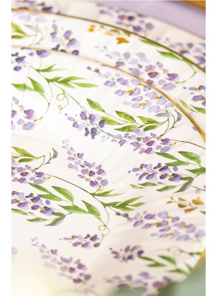 8 piatti da portata cm 27 Glicine. Secondo il linguaggio dei fiori il glicine è simbolo di bellezza, sensualità e salute, non bisogna pertanto stupirsi se viene utilizzato nelle occasioni più formali e solenni. Una cascata di fiori a grappolo decora in modo elegante il nostro piatto Glicine, preziosi dettagli dorati impreziosiscono il set tavola e donano luce e raffinatezza. I piatti Givi Italia rispettano l’ambiente, sono stati realizzati senza pellicola plastica, abbiamo sostituito il rivestimento con una base acquosa che garantisce il contatto alimentare e sono compostabili, li puoi gettare nell’umido.