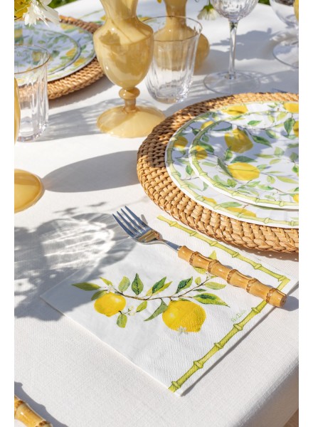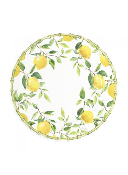 8 piatti da portata cm 27 Lemon Tree. Il piatto Lemon Tree presenta una superficie decorata da un motivo botanico ricco e continuo. Limoni gialli, grandi e luminosi, si alternano su tutta la superficie insieme a foglie verdi e fiori bianchi di agrumi, creando una composizione fitta ma armoniosa.Il bordo è definito da una canna di bamboo disposta a cerchio, stilizzata ma riconoscibile nei suoi segmenti e nei nodi caratteristici. Nel complesso, il piatto trasmette una sensazione di freschezza, armonia e gusto decorativo senza tempo. I piatti Givi Italia rispettano l’ambiente, sono stati realizzati senza pellicola plastica, abbiamo sostituito il rivestimento con una base acquosa che garantisce il contatto alimentare e sono compostabili, li puoi gettare nell’umido.