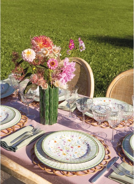 8 piatti da portata cm 27 Le jardin. Un piatto raffinato e luminoso, caratterizzato da una decorazione delicata che unisce freschezza e preziosità. Al centro, piccoli fiorellini colorati – nei toni del rosa, del giallo, dell’azzurro e del lilla – sono disposti con grazia. Le forme sono morbide e armoniose, creando un effetto vivace ma mai eccessivo. Il bordo del piatto è il vero elemento distintivo: una raggera verde porta freschezza ed un richiamo naturale, mentre il bordo oro aggiunge un tocco prezioso e sofisticato, esaltando la brillantezza della superficie. Nel complesso, il piatto trasmette un senso di eleganza romantica, perfetto per apparecchiature primaverili, tavole festive o per dare un accento ricercato anche ai momenti quotidiani. I nostri piatti sono realizzati senza utilizzo di film plastico, nel rispetto della direttiva europea SUP emanata per abolire il consumo di plastica nei prodotti monouso in Europa, inoltre hanno ottenuto la Certificazione TUVRheinland. Possono essere riciclati nell’umido.