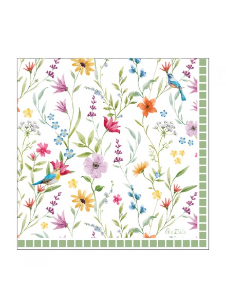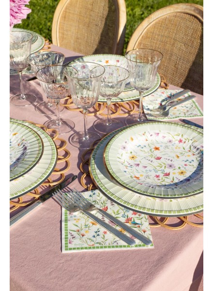 16 tovaglioli cm 33x33 Le jardin. Il coordinato tavola, con tutti i suoi elementi, unisce la spontaneità dei fiori primaverili alla struttura geometrica del bordo, creando un equilibrio perfetto tra freschezza naturale e decorazione sofisticata, ideale per una mise en place raffinata ma accogliente. I tovaglioli hanno ottenuto la certificazione Aticelca e pertanto possono essere riciclati nella carta