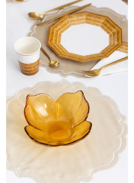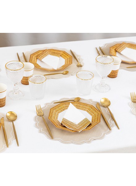 8 piatti in carta dalla forma geometrica cm 23x24 . I nostri piatti Rattan sono ideali per dare un tocco di originalita' alla tua tavola. I nostri piatti rispettano l'ambiente: hanno ottenuto la Certificazione Aticelca e sono quindi riciclabili nella carta.