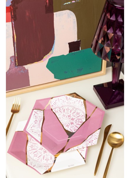 8 piatti esagonali in carta cm 23, 2 ass. Il decoro Kintsugi si ispira all'arte giapponese che insegna la filosofia che anche da una crepa puo' nascere bellezza. In ogni confezione troverai il decoro assortito nelle due versioni bianco su rosa e viceversa. I piatti Kintsugi Pink rispettano l'ambiente: hanno ottenuto la Certificazione Aticelca e sono quindi riciclabili nella carta.