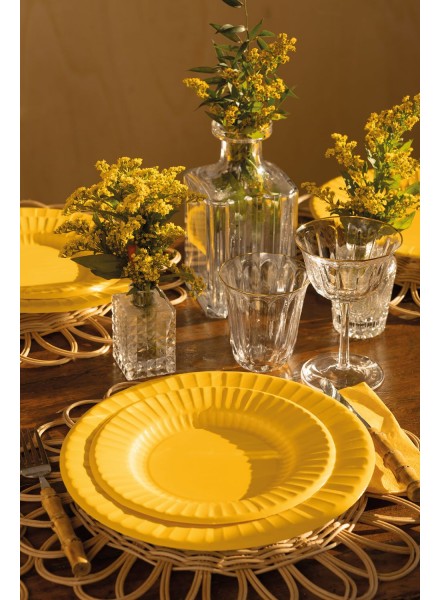 6 Sottopiatti cm 33 Giallo. Un maxi piatto giallo è un oggetto semplice ma molto versatile che può essere utilizzato in diversi modi sia in cucina sia come elemento decorativo. Grazie alle sue grandi dimensioni, è ideale come piatto da portata per servire pietanze da condividere, come pasta, insalate, frutta fresca, dolci o antipasti. Il colore giallo, luminoso e vivace, richiama il sole e contribuisce a rendere i cibi più invitanti e la tavola più allegra. Per questo motivo è particolarmente adatto durante pranzi con amici, aperitivi o buffet, dove può contenere finger food, snack o piccoli assaggi che gli ospiti possono prendere facilmente. Oltre al suo utilizzo per il cibo, il maxi piatto giallo può diventare anche un elemento decorativo per la tavola o per la casa. Posizionato al centro del tavolo, può ospitare una composizione di frutta, fiori, candele o piccoli oggetti decorativi, creando un punto di colore che rende l’ambiente più accogliente.