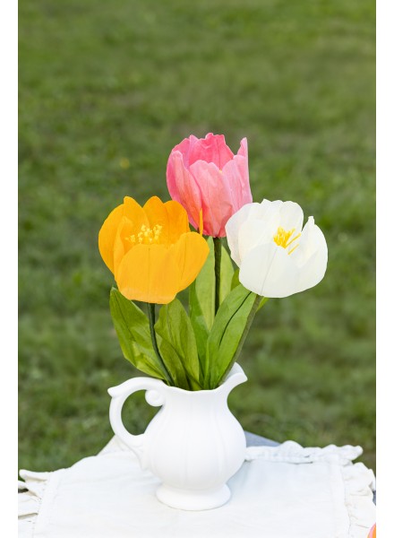 1 Fiore in carta con stelo cm 10X75. Il tulipano è una decorazione elegante e senza tempo. La tonalità avorio, calda e delicata, richiama la naturalezza dei fiori appena sbocciati, mentre la struttura in carta dona leggerezza e armonia alle forme. Lo stelo slanciato e le foglie accompagnano il fiore con equilibrio, creando un insieme raffinato e realistico. Perfetto per allestimenti, vetrine o ambienti domestici, questo tulipano in carta aggiunge un tocco di poesia e stile, mantenendo nel tempo la sua bellezza senza bisogno di cure.