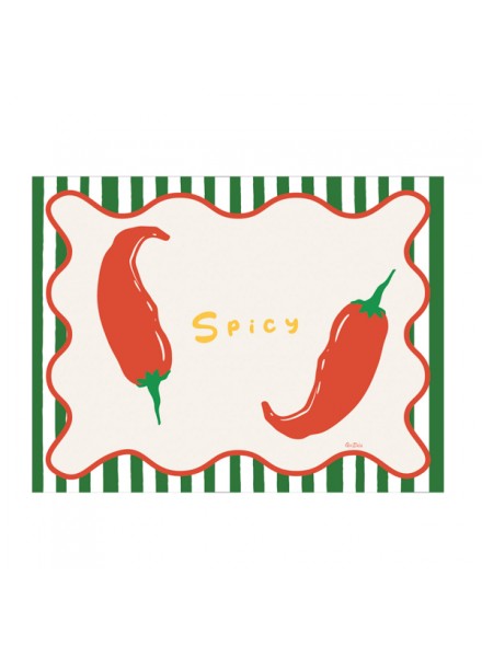 4 Tovagliette in carta cm 43X33 Spicy. La tovaglietta americana in carta si presenta con un design vivace e accattivante, pensato per portare energia e carattere alla tavola. Il fondo è decorato con righe verdi, che creano una base fresca e ordinata, perfetta per valorizzare gli elementi centrali della grafica. Al centro spiccano due peperoncini rossi, dal colore intenso e brillante, simbolo di gusto deciso e passione per i sapori forti. La loro presenza dona dinamismo alla composizione e richiama immediatamente l’idea di una cucina piccante e conviviale. A completare il design, la scritta “spicy” in giallo cattura l’attenzione, creando un contrasto armonioso con il verde e il rosso e rendendo la tovaglietta ancora più espressiva.