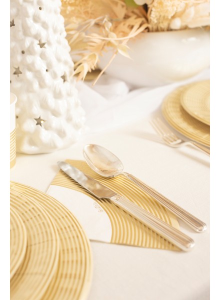 8 bicchieri 250 cc 3 veli 33x33 Elegance Gold. In un'atmosfera calda e luminosa, prende vita una tavola delle feste natalizie all’insegna dell’eleganza sobria e del raffinato buon gusto. L'effetto è luminoso ma mai eccessivo: l'oro è un protagonista discreto. Questa tavola è pensata per chi ama il Natale nella sua forma più elegante e luminosa, dove ogni elemento è studiato per trasmettere armonia, classe e intimità, rendendo ogni incontro un momento speciale da ricordare. I tovaglioli hanno ottenuto la certificazione Aticelca e pertanto possono essere riciclati nella carta