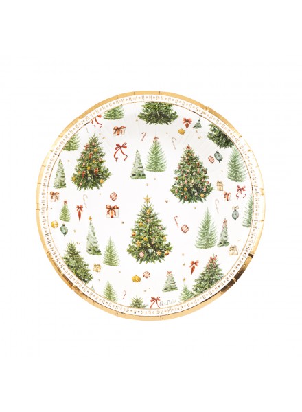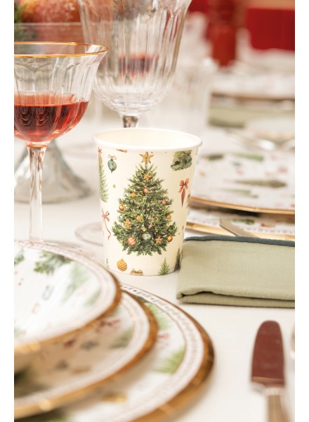 8 piatti fondi cm 24 Christmas Forest. I piatti sono i veri protagonisti: ogni posto a sedere è apparecchiato con un piatto decorato con un pattern natalizio — alberi stilizzati, fiocchi e palline. Sopra i piatti, i tovaglioli sono arrotolati con un nastrino rosso e un piccolo rametto di rosmarino, a evocare l’idea di un piccolo dono. I bicchieri in cristallo riflettono le luci natalizie e le posate d’argento completano l’equilibrio tra tradizione e festa. Givi Italia si impegna verso produzioni ecologicamente sostenibili, abbiamo recepito la direttiva europea SUP, i nostri piatti non contengono plastica e possono essere smaltiti nel contenitore dell’umido.