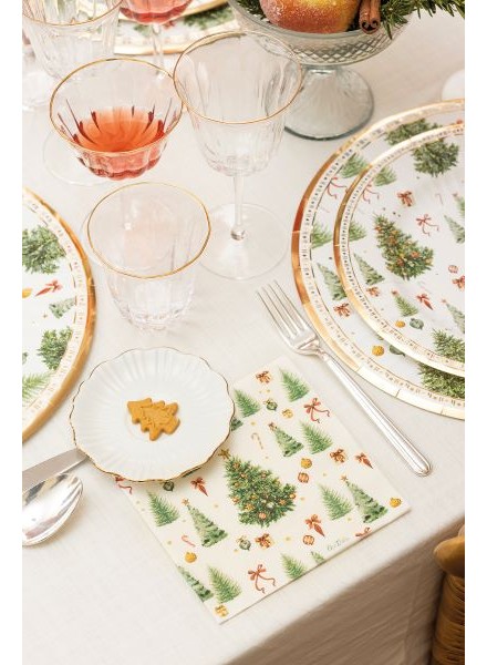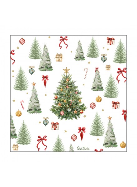 16 tovaglioli cm 33x33 3 veli Christmas Forest. La magia del Natale è tutta nei dettagli, immagina una tavola natalizia calda e accogliente, illuminata dalla luce soffusa delle candele, ogni posto a sedere è apparecchiato con un piatto decorato con un pattern natalizio. Sopra i piatti, i tovaglioli sono arrotolati con un nastrino rosso e un piccolo rametto di rosmarino, a evocare l’idea di un piccolo dono. Il coordinato Christmas Forest è un mix perfetto di tradizione, calore e atmosfera natalizia per una mise en place perfetta per un pranzo o una cena che si vuole ricordare. I tovaglioli hanno ottenuto la certificazione Aticelca e pertanto possono essere riciclati nella carta.
