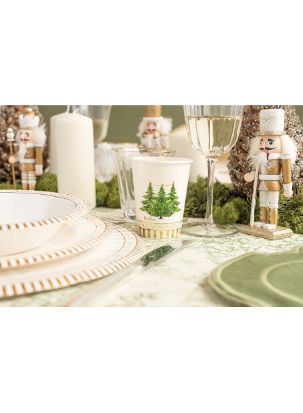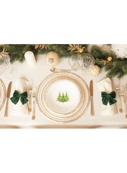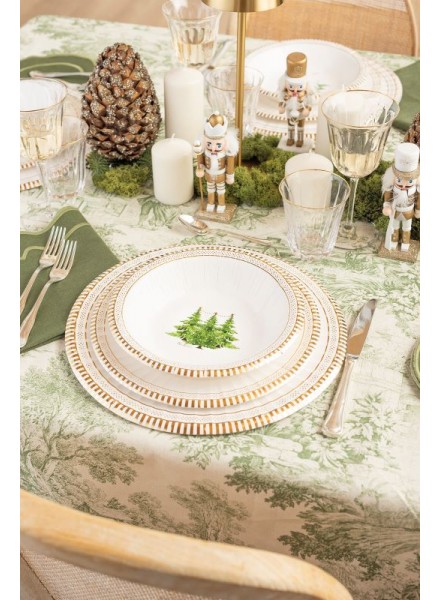 8 piatti fondi cm 24 Gold Trees. Immagina una tavola natalizia elegante e luminosa, apparecchiata con cura per creare un’atmosfera calda e festosa. I piatti sono bianchi decorati con delicati alberi di Natale stilizzati in tonalità verde abete e accenti dorati: piccoli dettagli in oro zecchino decorano in modo raffinato il bordo del piatto. I piatti sono disposti in modo impeccabile, i sottopiatti coordinati aggiungono una nota di lusso e fanno risaltare la decorazione. Al centro della tavola, un centrotavola con rami di pino fresco, pigne dorate, candele bianche e piccole sfere natalizie crea un profumo naturale e un’atmosfera magica. Ogni posto potrebbe essere personalizzato con un segnaposto dorato o una piccola decorazione a tema, come un rametto di agrifoglio o una mini ghirlanda. I nostri piatti sono realizzati senza utilizzo di film plastico, nel rispetto della direttiva europea SUP emanata per abolire il consumo di plastica nei prodotti monouso in Europa, inoltre hanno ottenuto la Certificazione TUVRheinland. Possono essere riciclati nell’umido.