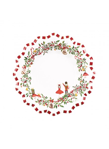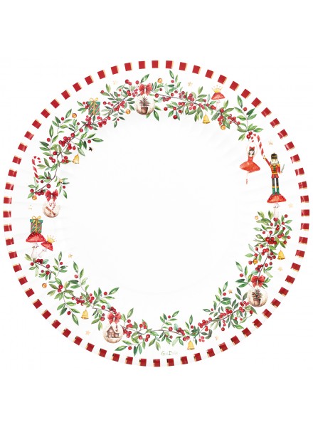 8 piatti fondi cm 24 Christmas Vintage. Apparecchiare una tavola natalizia con piatti decorati in stile Schiaccianoci è un’idea meravigliosa per creare un’atmosfera fiabesca e calorosa, perfetta per incantare grandi e piccoli durante le festività. Ispirata al celebre balletto, questa mise en place mescola eleganza e magia, fondendo elementi classici e dettagli incantati. Questo coordinato è molto più di una semplice decorazione: è un invito a sognare, a rivivere la magia del Natale con occhi incantati e cuore leggero. Un incontro perfetto tra tradizione, creatività e stile.8 piatti da dessert cm 21 Christmas Vintage. La tavola prende vita grazie al coordinato Christmas Vintage illustrato con figure iconiche: lo Schiaccianoci, la Ballerina in tutù, funghetti decorativi, palline luccicanti, rametti di pungitopo e bacche rosse. Ogni dettaglio richiama l’incanto del bosco e la grazia del teatro, il piatto bianco è decorato con una palette raffinata che gioca tra il rosso, il verde e l’oro caldo. Il centrotavola si trasforma in un piccolo scenario fiabesco, tra rami d’abete, candele, decorazioni vintage e miniature da favola. Givi Italia si impegna verso produzioni ecologicamente sostenibili, abbiamo recepito la direttiva europea SUP, i nostri piatti non contengono plastica e possono essere smaltiti nel contenitore dell’umido.