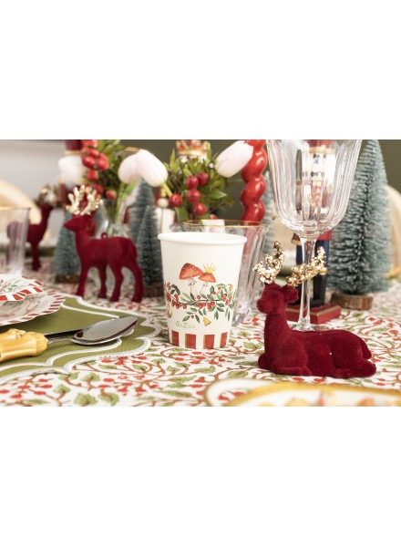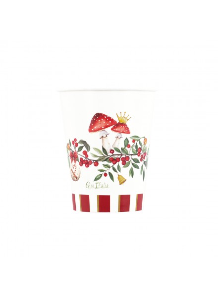 8 bicchieri 250 cc Christmas Vintage. La tavola prende vita grazie al coordinato Christmas Vintage illustrato con figure iconiche: lo Schiaccianoci, la Ballerina in tutù, funghetti decorativi, palline luccicanti, rametti di pungitopo e bacche rosse. Ogni dettaglio richiama l’incanto del bosco e la grazia del teatro, il bicchiere dallo sfondo bianco è decorato con una palette raffinata che gioca tra il rosso, il verde e l’oro caldo. I nostri bicchieri sono stati realizzati senza l’utilizzo della plastica e possono essere smaltiti nel contenitore dell’umido.