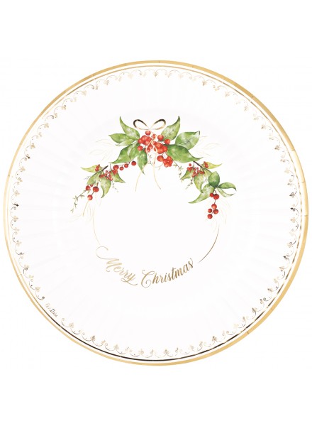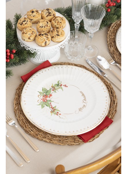 6 maxi piatti cm 33 Gold Garland. Questo piatto si distingue per il suo bordo impreziosito da dettagli dorati, sapientemente applicati, che donano luce e raffinatezza, trasformando ogni portata in un’esperienza da ricordare. Il centro è racchiuso dalla scritta Merry Christmas in oro lucido ed una piccola composizione di pungitopo intrecciato con bacche rosse brillanti dona un tocco di colore alla tua mise en place. I piatti Givi Italia rispettano l’ambiente, sono stati realizzati senza pellicola plastica, abbiamo sostituito il rivestimento con una base acquosa che garantisce il contatto alimentare e sono compostabili, li puoi gettare nell’umido.