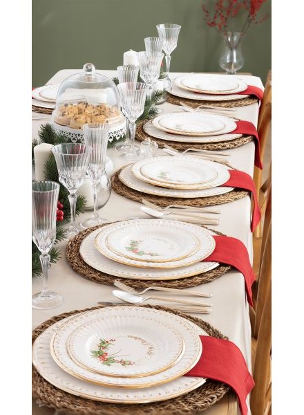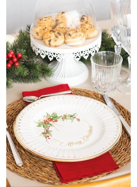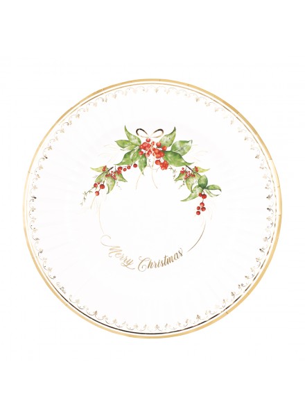 8 piatti da portata cm 27 Gold Garland. Il coordinato Gold Garland è perfetto per mise en place natalizia ricercata, questo piatto unisce tradizione e stile in un equilibrio armonioso, ideale per impreziosire pranzi e cene in famiglia o con gli amici. È il tipo di piatto perfetto per una tavola delle feste chic, dove ogni dettaglio contribuisce a creare un’atmosfera calda, luminosa e accogliente. Questo piatto si distingue per il suo bordo impreziosito da dettagli dorati, sapientemente applicati, che donano luce e raffinatezza, trasformando ogni portata in un’esperienza da ricordare. Il centro è racchiuso dalla scritta Merry Christmas in oro lucido, ed una piccola composizione di pungitopo intrecciato con bacche rosse brillanti dona un tocco di colore alla tua mise en place. I nostri piatti sono realizzati senza utilizzo di film plastico, nel rispetto della direttiva europea SUP emanata per abolire il consumo di plastica nei prodotti monouso in Europa, inoltre hanno ottenuto la Certificazione TUVRheinland. Possono essere riciclati nell’umido.