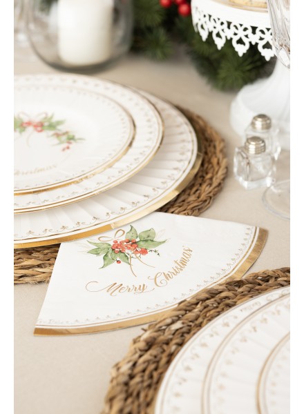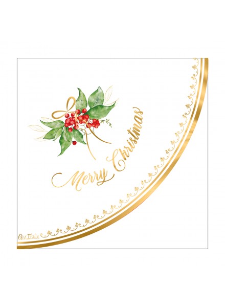 16 tovaglioli cm 33x33 3 veli Gold Garland. Il coordinato Gold Garland è perfetto per mise en place natalizia ricercata, questo piatto unisce tradizione e stile in un equilibrio armonioso, ideale per impreziosire pranzi e cene in famiglia o con gli amici. Il tovagliolo ha una base bianca, sul centro del piatto corre una delicata ghirlanda di pungitopo, i cui rametti verde intenso si intrecciano armoniosamente, punteggiati da bacche rosso brillante che spiccano sullo sfondo candido. La scritta Merry Christmas ed i piccoli dettagli dorati aggiungono un tocco di luce e raffinatezza, evocando lo scintillio delle decorazioni natalizie. I tovaglioli hanno ottenuto la certificazione Aticelca e pertanto possono essere riciclati nella carta