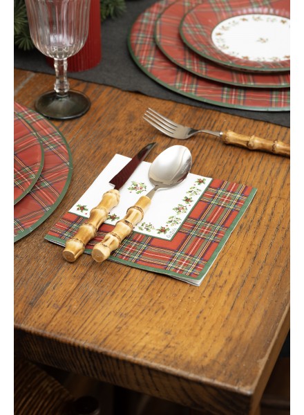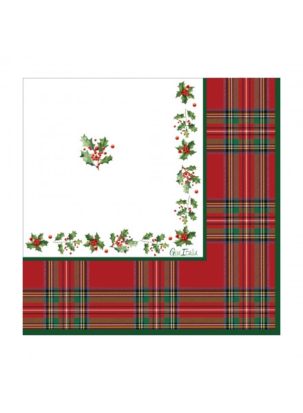 16 tovaglioli cm 33x33 3 veli Scottish Christmas. Immagina un lungo tavolo in legno massiccio, magari con qualche venatura a vista, al centro una decorazione naturale fatta di rami di abete, pigne, bacche rosse, e candele, i piatti sono decorati con un motivo tartan in stile Scottish per donare un senso di accoglienza e di tradizione ai tuoi commensali. Ecco la tua tavola natalizia: un mix perfetto tra eleganza e comfort rustico, dove il tartan non è solo uno stile, ma un abbraccio visivo che racconta tradizione e festa. I tovaglioli hanno ottenuto la certificazione Aticelca e pertanto possono essere riciclati nella carta.