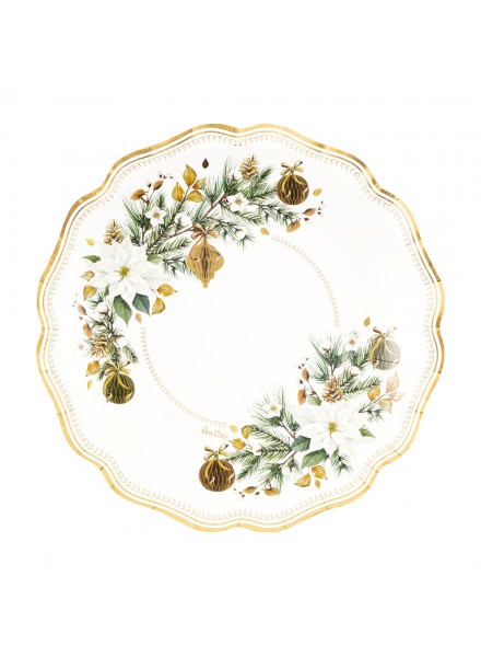 8 piatti da portata cm 27 Noel. La tavola si apre come un racconto di Natale raffinato, dove ogni dettaglio è pensato per evocare bellezza, calore e natura. Al centro dell’attenzione il coordinato Noel, un piatto dallo sfondo bianco con profilo dorato cattura subito lo sguardo: sobrio ma luminoso, elegante senza eccessi, incarna perfettamente lo spirito delle feste. Il cuore decorativo è una ghirlanda di rami di pino che scorre lungo il bordo dei piatti e degli altri elementi. Tra gli aghi di pino, trovano posto stelle di Natale bianche, simboli di purezza e serenità, che si aprono candide contro il verde dei rami. Pigne naturali, lasciate al loro colore originale per richiamare la bellezza semplice del bosco, e palline in carta, leggere e opache, in tonalità neutre – beige o mocha mousse– che aggiungono texture senza appesantire. Givi Italia si impegna verso produzioni ecologicamente sostenibili, abbiamo recepito la direttiva europea SUP, i nostri piatti non contengono plastica e possono essere smaltiti nel contenitore dell’umido.