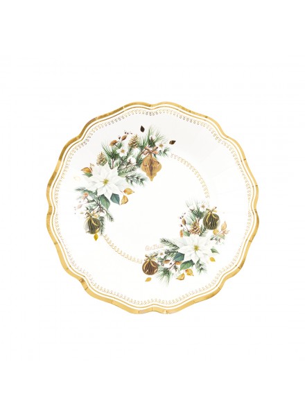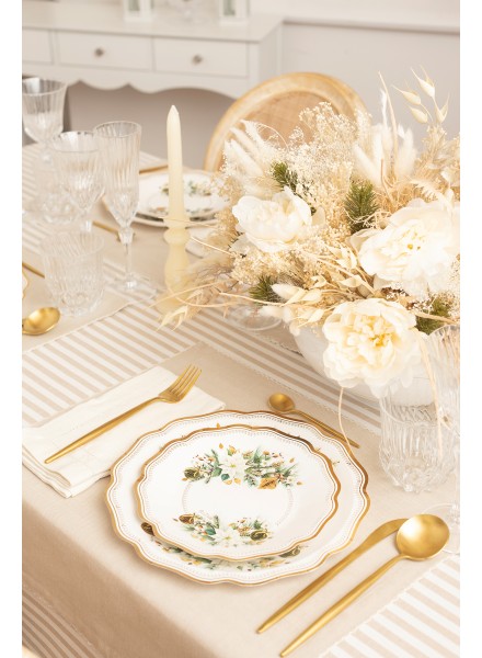 8 piatti da dessert cm 21 Noel. Il cuore decorativo del piatto è una ghirlanda di rami di pino che scorre lungo il bordo dei piatti e degli altri elementi. Tra gli aghi di pino, trovano posto stelle di Natale bianche, simboli di purezza e serenità, che si aprono candide contro il verde dei rami. Pigne naturali, lasciate al loro colore originale per richiamare la bellezza semplice del bosco, e palline in carta, leggere e opache, in tonalità neutre – bianche, beige o dorate – che aggiungono texture senza appesantire. In questa tavola natalizia, la natura si fa elegante, l’oro non è sfarzo ma luce, e ogni elemento parla di cura, equilibrio e bellezza autentica. I piatti Givi Italia rispettano l’ambiente, sono stati realizzati senza pellicola plastica, abbiamo sostituito il rivestimento con una base acquosa che garantisce il contatto alimentare e sono compostabili, li puoi gettare nell’umido.