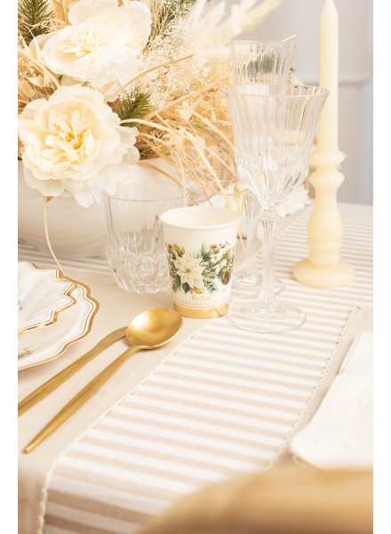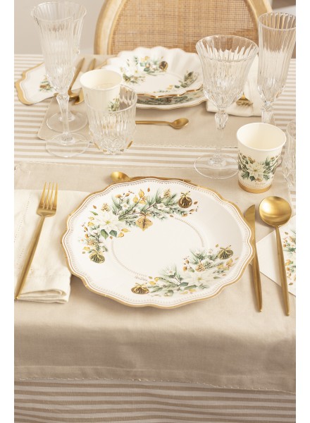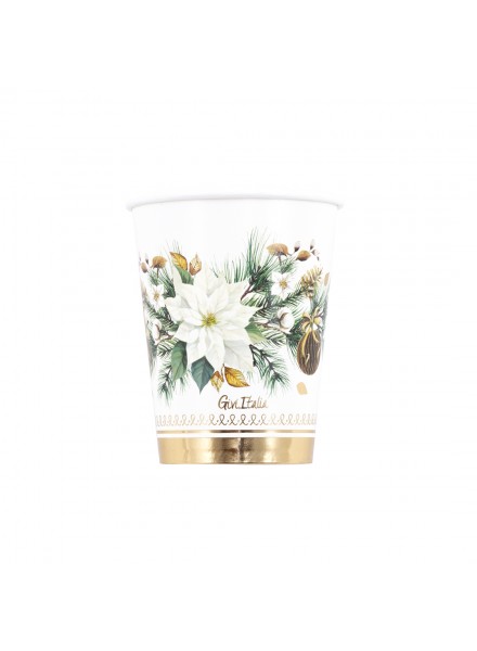 8 bicchieri 250 cc Noel. Il cuore decorativo del coordinato è una ghirlanda di rami di pino che scorre lungo il bordo dei piatti e degli altri elementi. Tra gli aghi di pino, trovano posto stelle di Natale bianche, simboli di purezza e serenità, che si aprono candide contro il verde dei rami. Pigne naturali, lasciate al loro colore originale per richiamare la bellezza semplice del bosco, e palline in carta, leggere e opache, in tonalità neutre – beige o mocha mousse – che aggiungono texture senza appesantire. In questa tavola natalizia, la natura si fa elegante, l’oro non è sfarzo ma luce, e ogni elemento parla di cura, equilibrio e bellezza autentica. I nostri bicchieri sono stati realizzati senza l’utilizzo della plastica e possono essere smaltiti nel contenitore dell’umido.