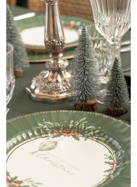 6 maxi piatti cm 33 Merry Christmas to you. I piatti sono decorati da rami di vischio e pungitopo, intrecciati tra loro come una piccola ghirlanda, il verde intenso delle foglie si alterna con il rosso vivo delle bacche, creando un contrasto classico ma sempre attuale. Una preziosa pallina elegantemente decorata dona un tocco di raffinatezza e ricercatezza al coordinato. La tavola è apparecchiata con il coordinato Merry Christmas to you, piatti color verde bosco, dal bordo sottile champagne, donano profondità e raffinatezza al centro si leggono le parole: Wishing you a Merry Christmas, un augurio che è anche un invito alla celebrazione, un tocco glamour, perfetto per chi ama unire tradizione e stile personale.