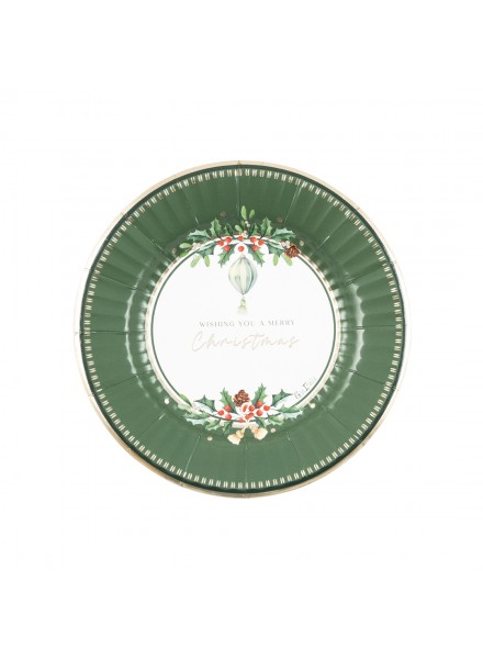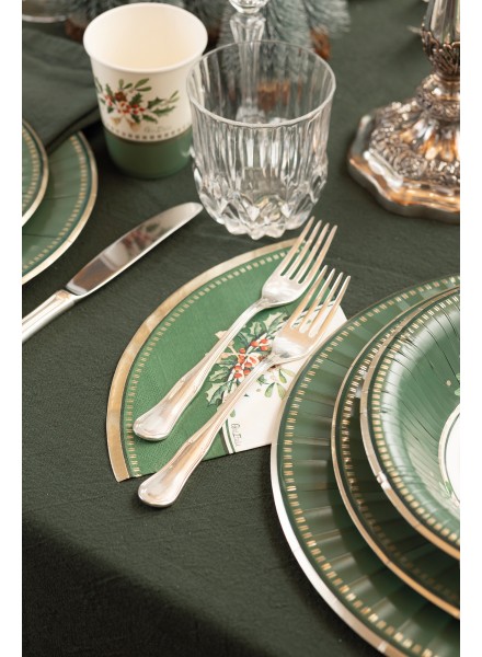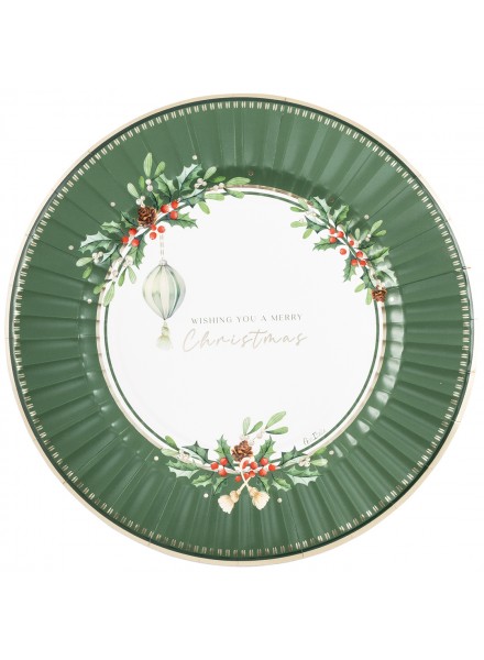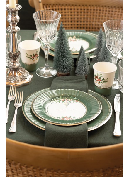 8 piatti da dessert cm 21 Merry Christmas to you. Il coordinato Merry Christmas to you è decorato da rami di vischio e pungitopo, intrecciati tra loro come una piccola ghirlanda, il verde intenso delle foglie si alterna con il rosso vivo delle bacche, creando un contrasto classico ma sempre attuale. Una preziosa pallina elegantemente decorata dona un tocco di raffinatezza e ricercatezza al piatto, al centro si leggono le parole: Wishing you a Merry Christmas, un augurio che è anche un invito alla celebrazione, un tocco glamour, perfetto per chi ama unire tradizione e stile personale. I nostri piatti sono realizzati senza utilizzo di film plastico, nel rispetto della direttiva europea SUP emanata per abolire il consumo di plastica nei prodotti monouso in Europa, inoltre hanno ottenuto la Certificazione TUVRheinland. Possono essere riciclati nell’umido.