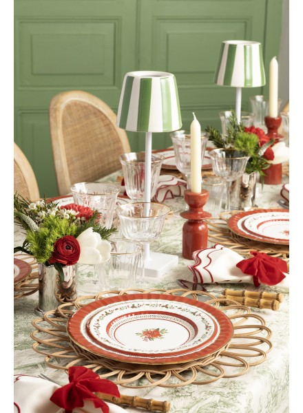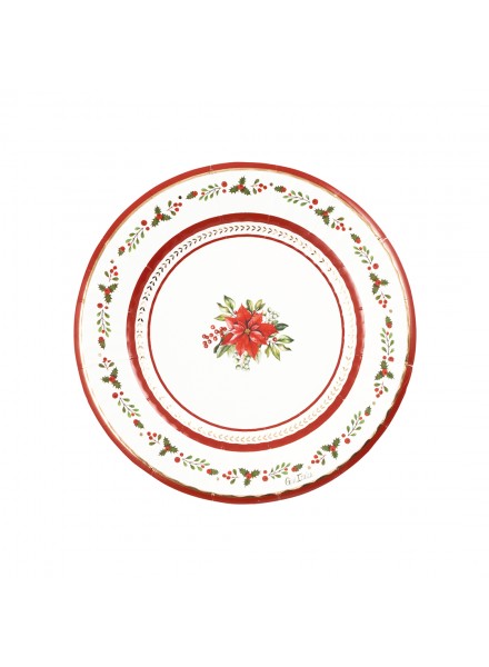 8 piatti da dessert cm 21 Red Royal. Il coordinato Red Royal dal design ricercato cattura subito lo sguardo: il bordo è adornato da raffinati motivi di agrifoglio, con foglie verde intenso e bacche rosse vivaci, mentre al centro troneggia una splendida stella di Natale dai petali rosso cremisi, come dipinta a mano. Questo decoro, delicato ma d'impatto, trasforma il piatto in un piccolo capolavoro natalizio, perfetto connubio tra arte e spirito delle feste. Una tavola che accoglie, scalda il cuore e celebra con stile l’incanto delle festività.