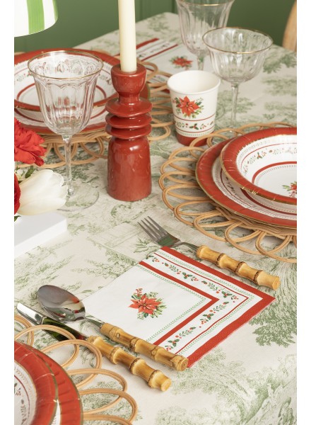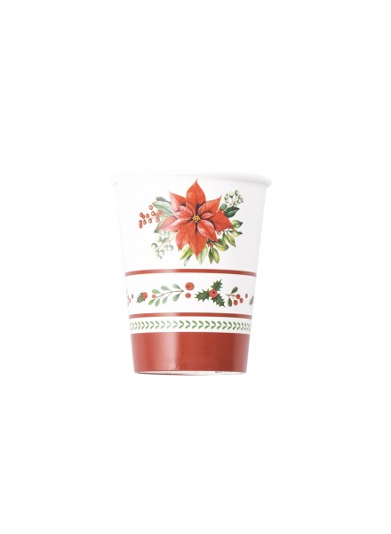 8 bicchieri 250 cc Red Royal. Al centro della scena, il coordinato Red Royal dal design ricercato cattura subito lo sguardo: il bordo è adornato da raffinati motivi di agrifoglio, con foglie verde intenso e bacche rosse vivaci, mentre al centro troneggia una splendida stella di Natale dai petali rosso cremisi, come dipinta a mano. Questo decoro, delicato ma d'impatto, trasforma il piatto in un piccolo capolavoro natalizio, perfetto connubio tra arte e spirito delle feste. Una tavola che accoglie, scalda il cuore e celebra con stile l’incanto delle festività. I nostri bicchieri sono stati realizzati senza l’utilizzo della plastica e possono essere smaltiti nel contenitore dell’umido.