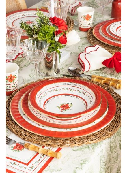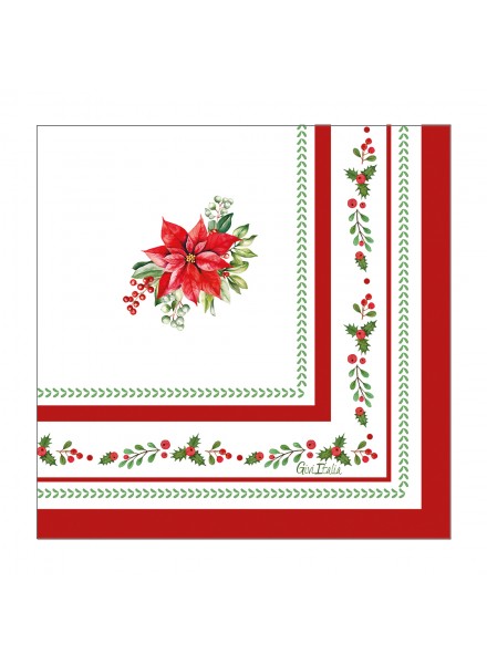 16 tovaglioli cm 33x33 3 veli Red Royal. Tutto è curato nei minimi particolari per richiamare l’eleganza del Natale più autentico: il bianco richiama la purezza e la quiete della neve, il rosso simboleggia il calore, la convivialità, l’amore. Al centro della scena, il coordinato Red Royal dal design ricercato cattura subito lo sguardo: il bordo è adornato da raffinati motivi di agrifoglio, con foglie verde intenso e bacche rosse vivaci, mentre al centro troneggia una splendida stella di Natale dai petali rosso cremisi, come dipinta a mano. Questo decoro, delicato ma d'impatto, trasforma il piatto in un piccolo capolavoro natalizio, perfetto connubio tra arte e spirito delle feste. I tovaglioli hanno ottenuto la certificazione Aticelca e pertanto possono essere riciclati nella carta.